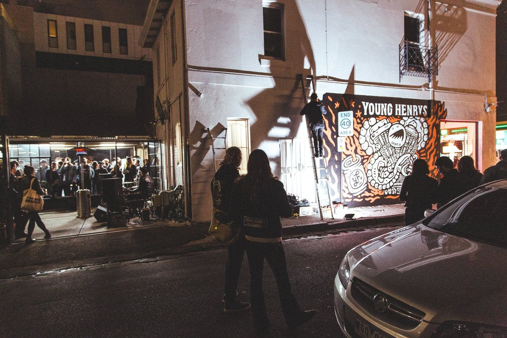 So on a looooovely sunny day in Melbourne, I was painting the side of the Saint Denim Co store... preparing it for the Young Henrys takeover event that night, for the launch of their Motorcycle Oil beer.